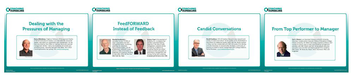 Coachingourselves學(xué)習(xí)模塊的作者為領(lǐng)先的管理和商業(yè)思想家和實(shí)踐者,其中不乏Henry Mintzberg、Edgar Schein、Marshall Goldsmith、Phillip Kotler、Dave Ulrich、Linda Hill、Nancy Adler、Ricardo Semler等大師,凝煉了最深刻最前沿的主題精髓。